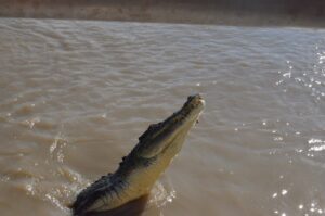 Pierwszym przystankiem podczas wycieczki był rejs po rzece Adelaide. Główną atrakcją jest oglądanie krokodyli w ich naturalnym środowisku. I to nie byle jakich, bo słonowodnych, czyli największych z dwóch rodzajów osobników zamieszkujących Australię. Ich długość może dojść do nawet 7 metrów. Statystyki wskazują, że na antypodach występuje od 150 tysięcy do 200 tysięcy gadów, z czego w samym Terytorium Północnym jest ich ponoć 100 tysięcy! Podczas rejsu z naprawdę niewielkiej odległości można oglądać krokodyle. Szczególnie te, które skuszą się na kawałek mięsa oferowanego przez pracownika na łodzi.