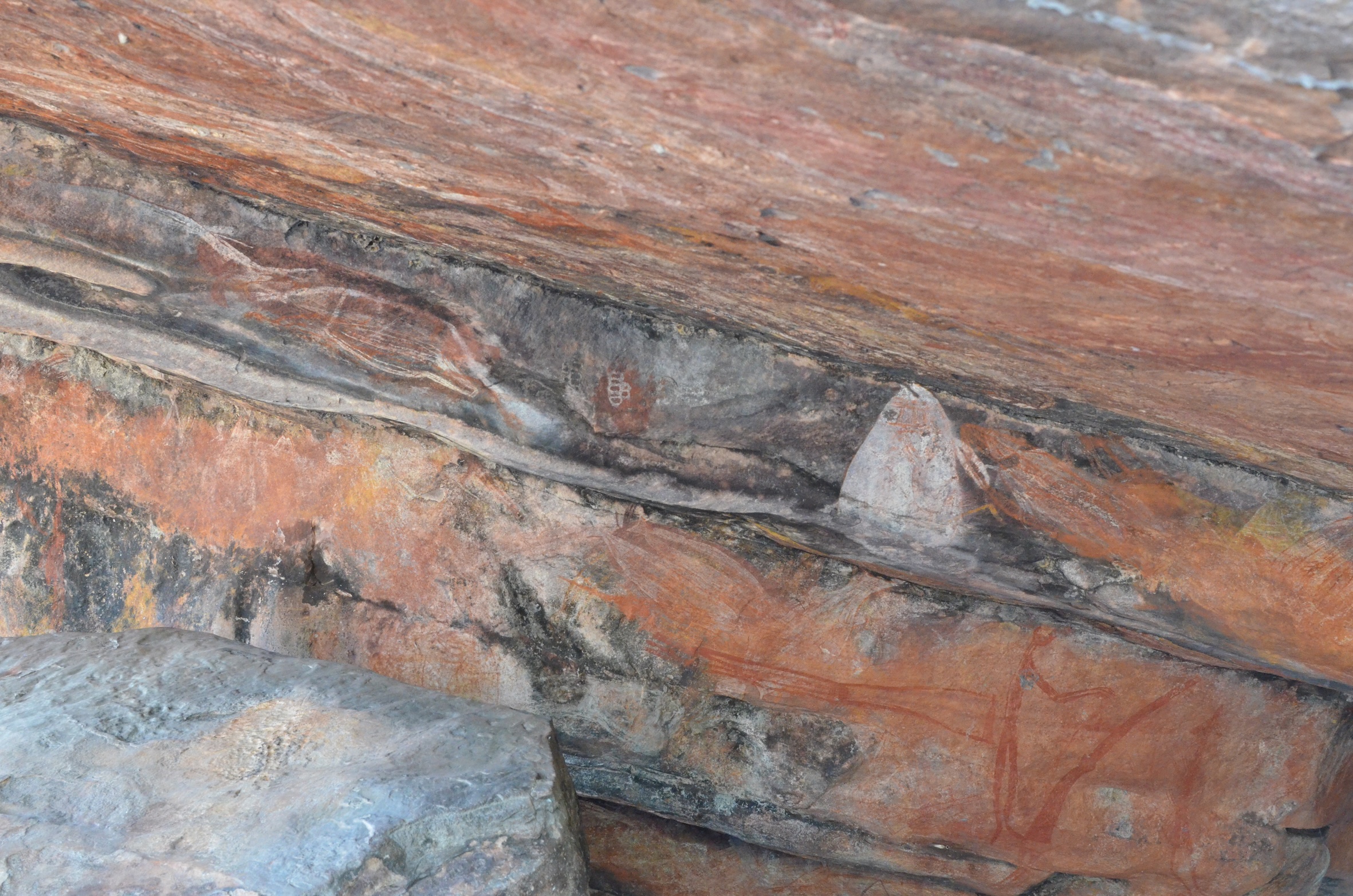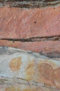 W Ubirr podążaliśmy wyznaczoną około kilometrową ścieżką, prowadzącą przez pięć „galerii skalnych”: Mabuyu, Main Art Gallery, Crosshatching Gallery, Namarrkan Sisters i Rainbow Serpent. Każda z nich prezentowała wyjątkową kolekcję malowideł w kolorze rdzy i czerwieni. Większość przedstawiała ludzi oraz zwierzęta, np. ryby, kolczatki, kangury, goanny czy małże.